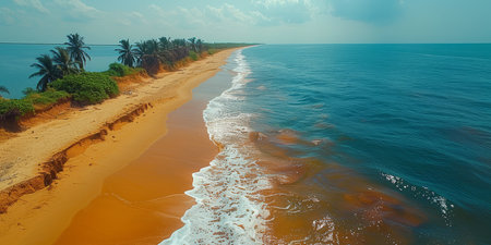 Aerial drone of Sandy beach with palm trees and turquoise water. Sri Lanka.
