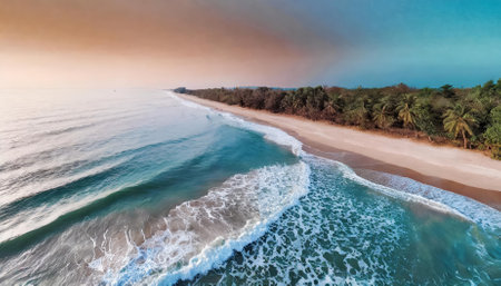 Experience the serene charm of this mesmerizing drone photograph capturing a picturesque beach scene with vibrant turquoise waters, gentle waves, and warm sunlight, perfectly highlighting