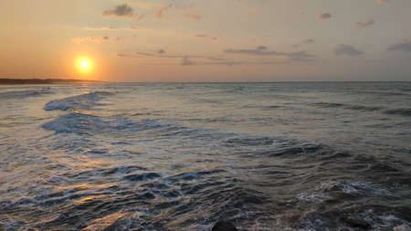 Seascape horizon with rocks in the water and ocean waves at sunrise on Cabarete beach, Dominican Republic