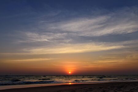 Beautiful sky colorful sunset on the ocean, natural landscapes. Deserted beach, the sun sets in the clouds above the sea.