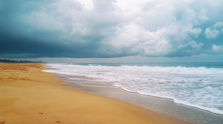 Experience the captivating beauty of ocean waves crashing gently at sunset. The dramatic clouds add depth and allure to this serene and tranquil seascape.