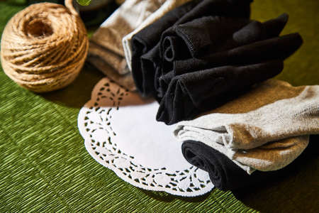 Several pairs of new male cotton socks on a green surface, skein of thread and flowers background. The concept of coziness and comfort. Gift to a man and taking care of him