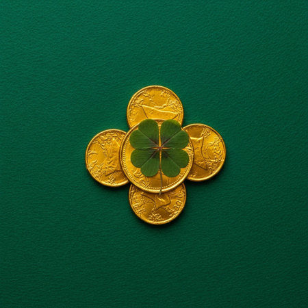 Extreme close-up of a perfect four-leaf clover and scattered gold coins on dark green felt for St. Patrick's Day luck and fortune.