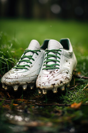 Retro old sneakers and vinyl record on green background. 80s. Top view