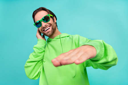 Photo of funky dj entertainer guy imagine mixing track wear green sweatshirt isolated turquoise color background