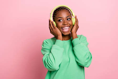 Photo of positive charming girl hands touch headphones enjoy song isolated on pink color background