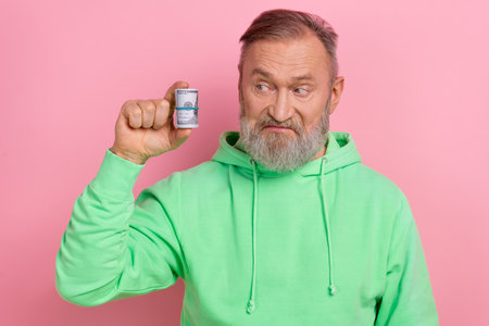 Photo of uncertain thoughtful guy dressed green hoodie looking showing money roll isolated pink color background
