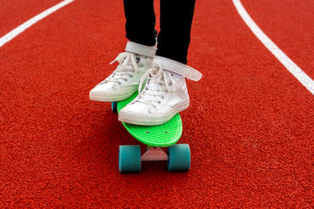 Close up of green skateboard with orange wheels on green background. Plastic mini cruiser board. Creative concept. Minimalism, flat lay, copy space