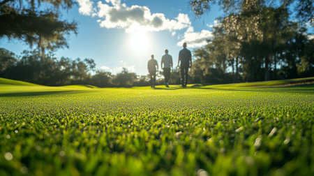 Leisure, Friendship, and Sport Three Male Friends Enjoy a Sunny Day on the Golf Course.