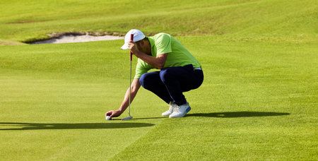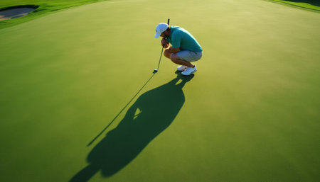A golfer crouches low on a vibrant green putting green, intently studying the line of his putt as the sun casts a long shadow behind him. The serene atmosphere is enhanced by the lush surroundings, highlighting the precision and concentration required in the game of golf.