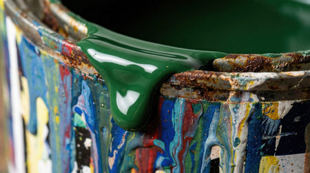 A round music green vinyl record on a duotone red gray background. Retro audio technology. Place for text.