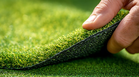 Close-up showcases an artificial turf inspection with a finger lifting the lush green grass revealing the underlying black backing. Quality testing of synthetic lawn surface.