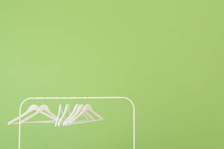Trendy clothes of neo mint color on hangers lit by the sun beams in the showroom. Shopping, sale and fashion concept. Happy mood with a big choice of everyday outfit. Trend of 2020.