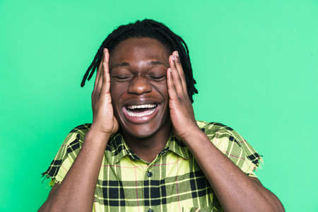 Young black man with dreadlocks laughing while holding his head isolated over green background
