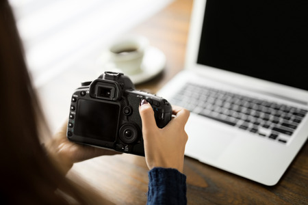 Point of view of a young female photographer holding camera and checking photos on her desk