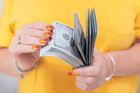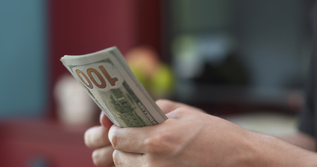 Dollar banknotes in female hands. Woman's hands counting money, currency of United States. Close-up. Selective focus. Copy space.