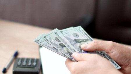 A closeup of a woman's hands counting dollar bills, on a white desk.