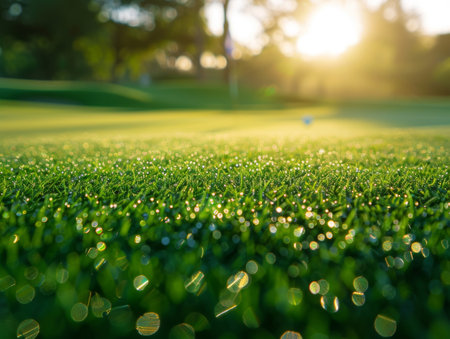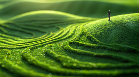 A golfer prepares to putt on a meticulously maintained green surface, showcasing skill and focus in the vibrant sunlight. Perfect for sports themes.