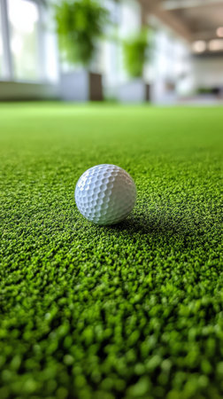Close-up of a golf ball on green artificial turf in an indoor setting. Sport and recreation concept