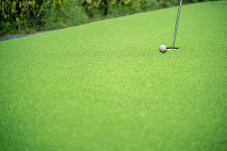 Playing mini golf on artificial green grass outdoors. Setting goals and winning lifestyle concept. Fun vacation entertainment for summertime. Putting club at ball on golf course. Blank space for copy.