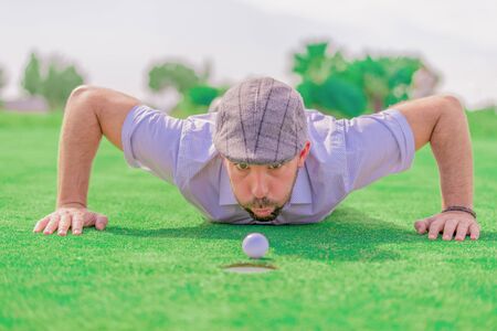 Portrait of a man with a beard and a grey cap, trying to move a white golf ball blowing, with the background out of focus. Colorful photo