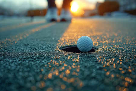 A serene scene featuring a golf ball near the hole with a long shadow cast on the green, capturing the essence of golf in a peaceful outdoor setting.