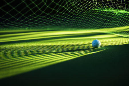 A golf ball lies on vibrant green turf, casting shadows under a nearby net during the evening light.