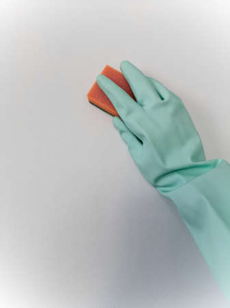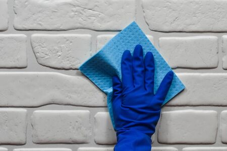 Worker's hand in a rubber protective glove with a rag wiping the surface of a table or wall in a room, bathroom, kitchen. Early spring or regular cleaning. The concept of cleanliness