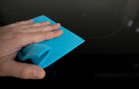 An orange glove with a yellow sponge washes the kitchen hob, watered down with a cleaning agent. Home Cleaning Concept