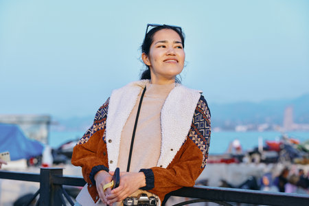 Smiling woman in a stylish jacket enjoying a breezy seaside day, sunglasses on head, casual fashion on a boardwalk with ocean backdrop and distant boats, candid lifestyle moment.