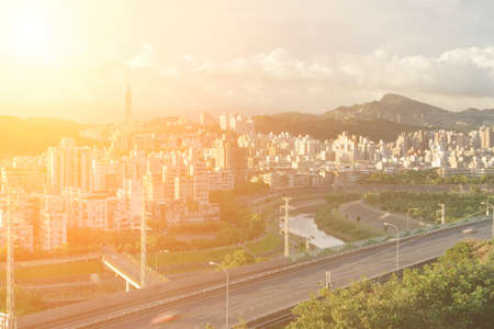 Bangkok city skyline at sunset with skyscrapers, Thailand.