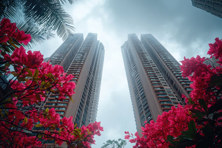 Vibrant bougainvillea frames urban towers capturing natures beauty in cloudy weather