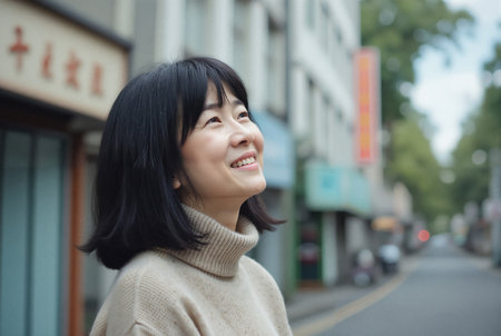 Asian woman with a medium skin tone, straight black hair, and a bob cut, wearing a grey turtleneck sweater. She stands on a tree-lined street with a serene, confident smile. The background features blurred trees and a faintly visible building, suggesting a calm urban setting.