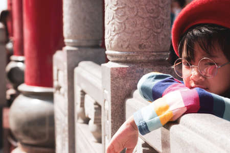 Asian child girl dressed up in a rainbow sweater. Wear red lens glasses and wear red hats that are stressful and in a bad mood.
