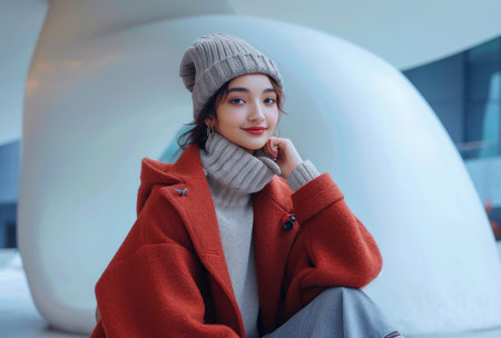 young woman sitting at a big round white circle wearing a red coat and hat.