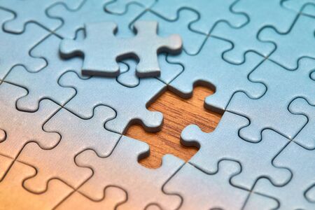 Unfinished white jigsaw puzzle pieces on blue background, The last piece of jigsaw puzzle, Copy space.