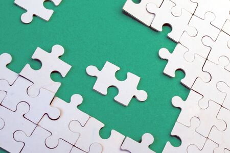 A close up of puzzle pieces. white puzzle piece separate with white puzzle grid green backdrop. High quality photo