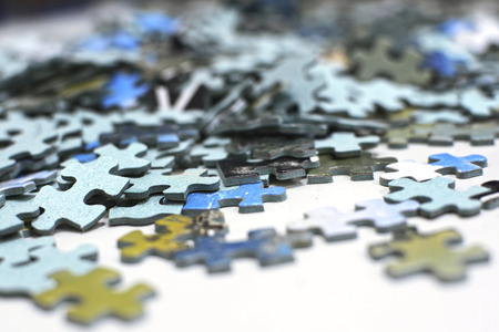 Jigsaw puzzle pieces piled up awaiting being pieced together