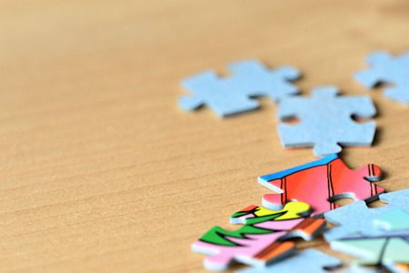Top view Shot of wooden jigsaw puzzle pieces ,Business concept