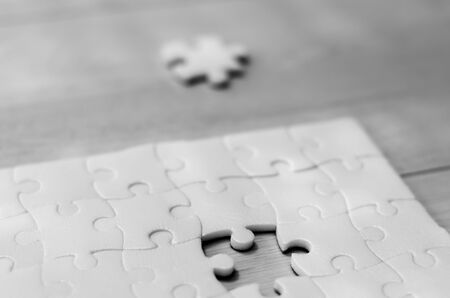Closed up shot of blank white puzzle pieces, selective focus, copy space for text