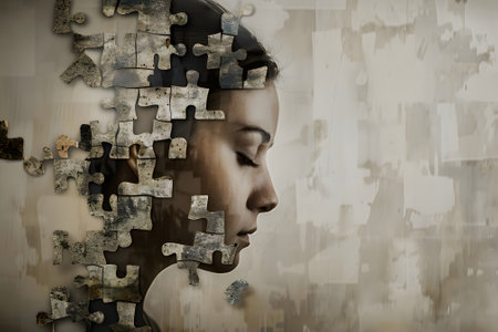 A womans head covered with scattered puzzle pieces, representing complexity