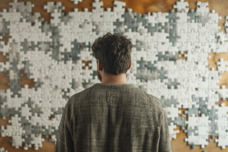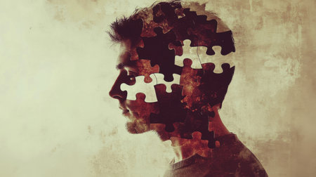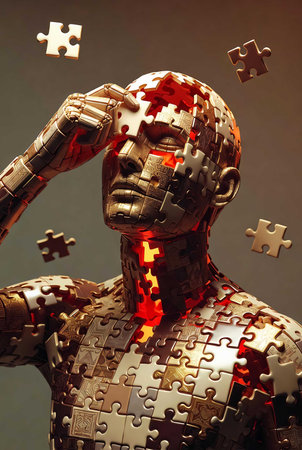 Abstract representation of internal uncertainties, a man with a puzzle-patterned head on a dark backdrop. Thoughts entwined with confusion