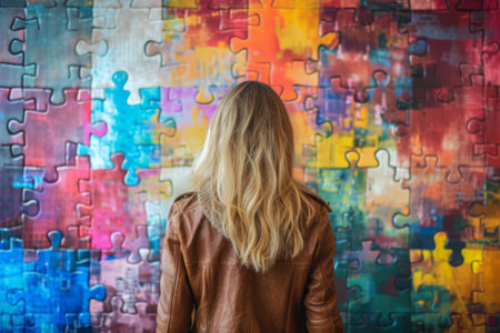 Back view of woman watching on big puzzle on wall. Generative AI illustration