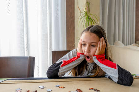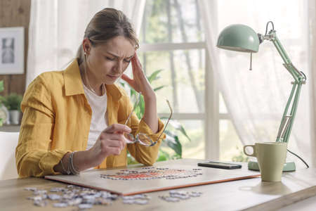 Young woman solving a puzzle at home, she is having a headache