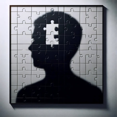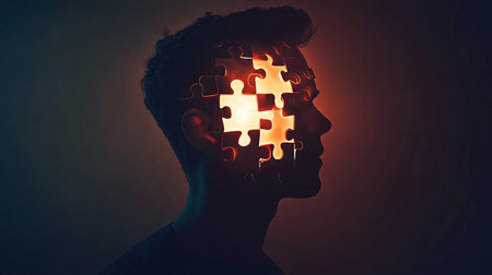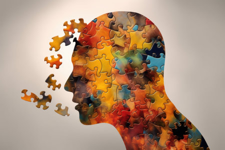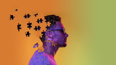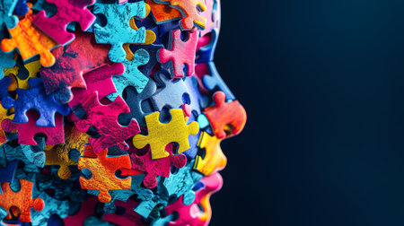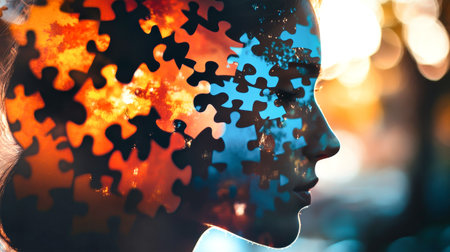 A silhouette of a man's face merges with vibrant puzzle pieces against an abstract backdrop, symbolizing the intricacies of identity and thought.