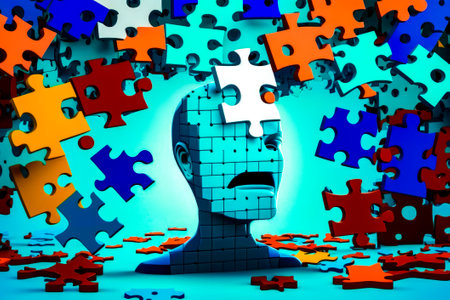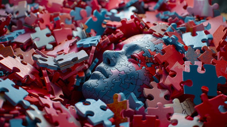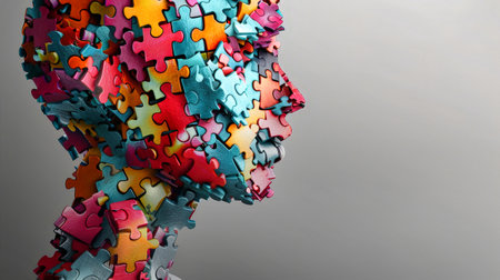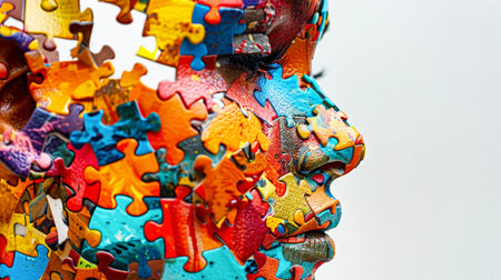 A human head shape assembled using interconnected puzzle pieces, symbolizing complexity and interconnectedness of the mind.