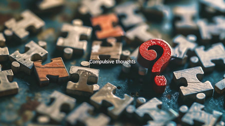 A close-up image showcasing interlocking puzzle pieces on a dark surface, emphasizing texture, color variations, and subtle light reflections to create an intriguing atmosphere.