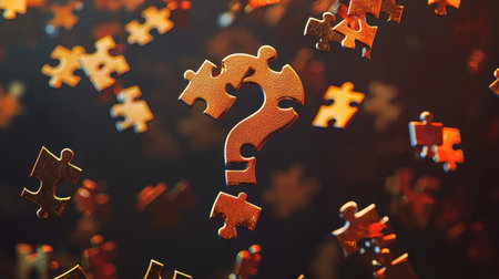 This image features a golden question mark surrounded by floating puzzle pieces in an enigmatic atmosphere, symbolizing curiosity and exploration.