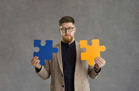 Confused man trying to solve a business problem. Young guy in hipster glasses holding two orange and blue jigsaw puzzle pieces and looking at them in confusion standing isolated on grey background