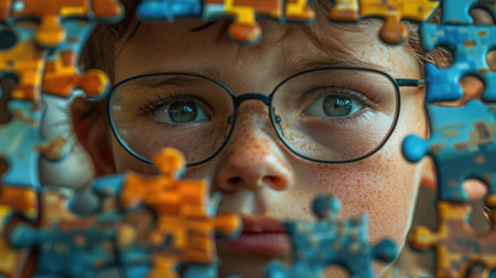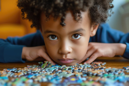 Close up of skilled elementary student looking jigsaw while looking at camera. Attractive children working, playing, solving puzzle while colorful jigsaw scatter around at blurring background. AIG42.